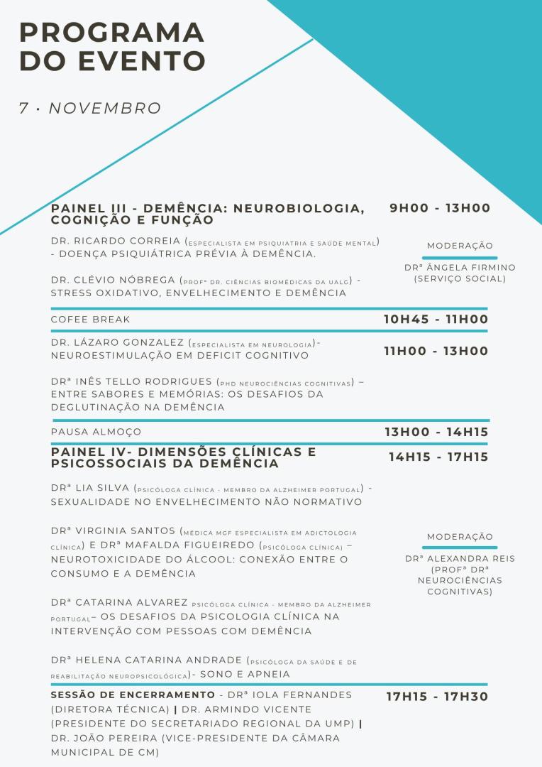 O segundo dia tem no seu programa temas como “Doença Psiquiátrica Prévia à Demência”, “Stress Oxidativo, Envelhecimento e Demência”, “Neuroestimulação em Deficit Cognitivo”, “Entre Sabores e Memórias: Os Desafios da Deglutinação na Demência”, “Sexualidade no Envelhecimento Não Normativo”, “Neurotoxicidade do Álcool: Conexão entre o Consumo e a Demência”, “Os Desafios da Psicologia Clínica na Intervenção com Pessoas com Demência” e “Sono e Apneia”.