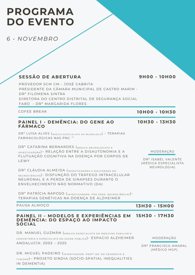 Este congresso, organizado pela Estrutura Residencial e Centro de Dia de Alzheimer e Demências José Cabrita em parceria com o Município de Castro Marim e a Universidade do Algarve, irá iniciar-se com uma sessão de abertura agendada para as 09h00 do dia 6 de novembro.